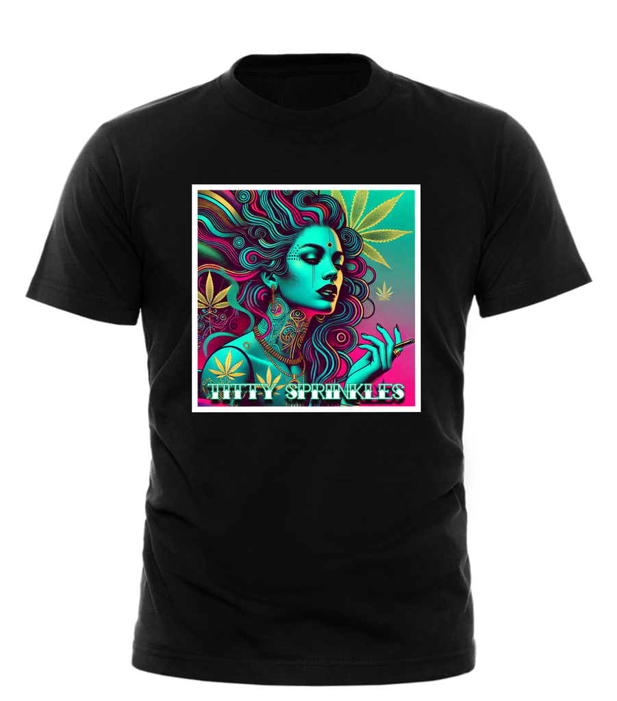 Stoned Temptation doesn’t knock—she kicks down the door in high heels and haze. She’s full lips, sharp wit, and enough THC to make you cancel your plans. Tee, sticker, or print—she’s your next impulsive decision, and she looks damn good doing it.