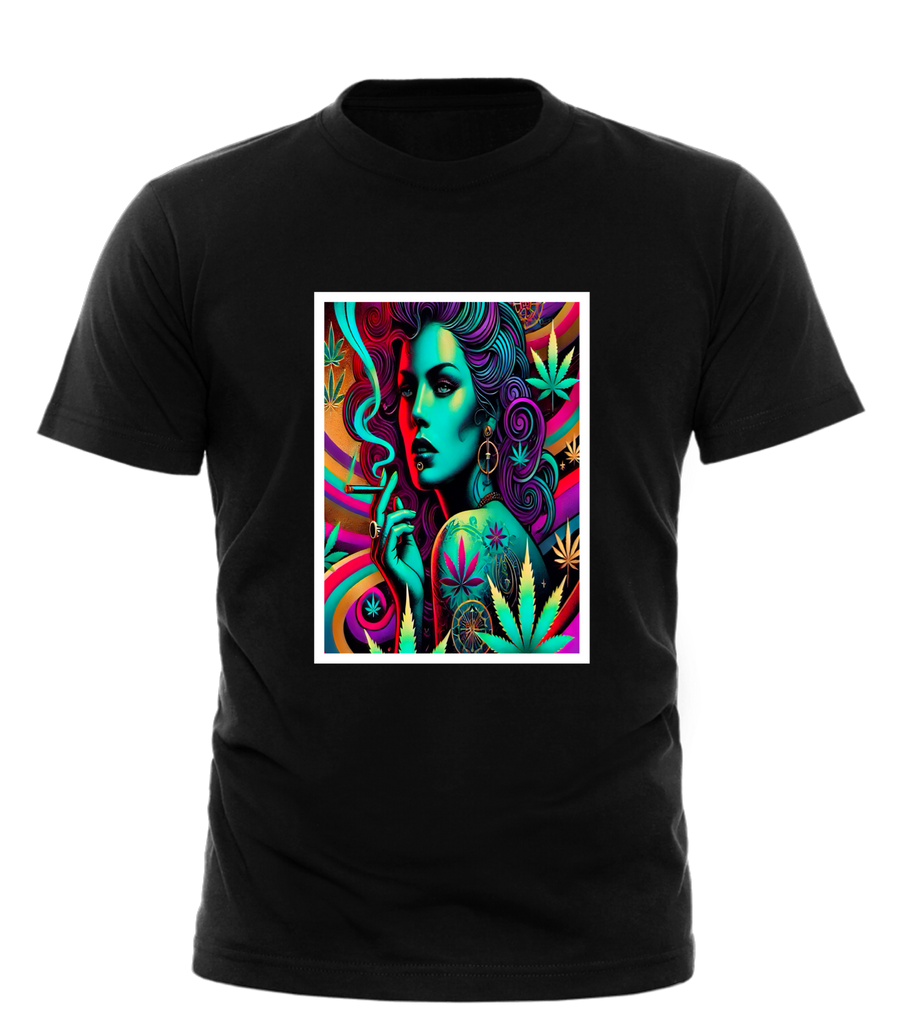 Kush Siren doesn’t lure you in—she lets you drift. With a body like a spell and a stare that hits like a dab rig, she brings pure stoner fantasy to life. Tee, sticker, or print—she’s instant obsession.